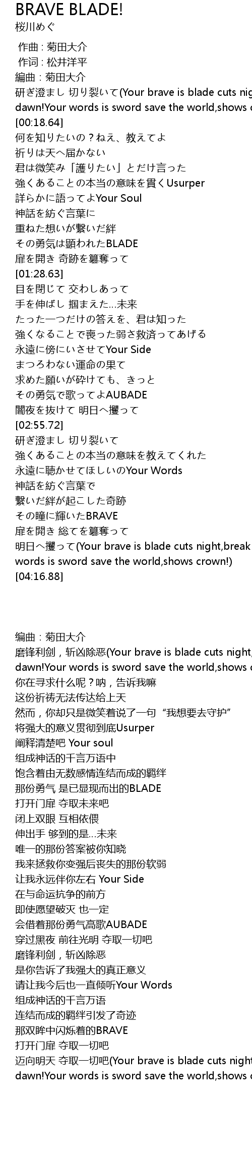 | [00:06.15] | 研ぎ澄まし 切り裂いて(Your brave is blade cuts night,break dawn!Your words is sword save the world,shows crown!) |