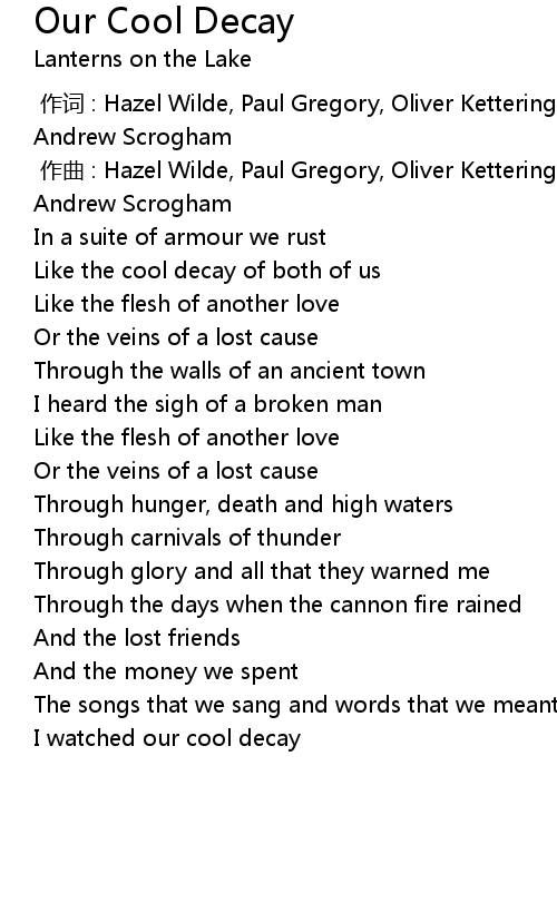 | [00:01.000] | 作曲 : Hazel Wilde, Paul Gregory, Oliver Ketteringham, Sarah Kemp, Andrew Scrogham |