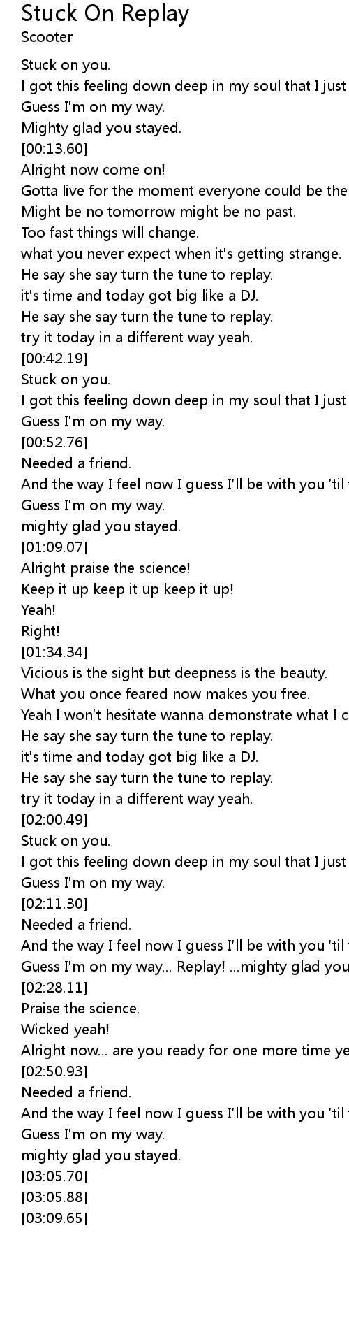 | [00:29.30] | He say she say turn the tune to replay. |