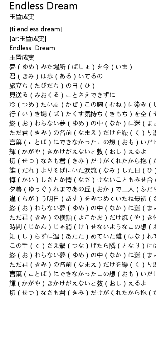| [02:25.310] | 終(お)わらない夢(ゆめ)の中(なか)に迷(まよ)い込(こ)んでだ |