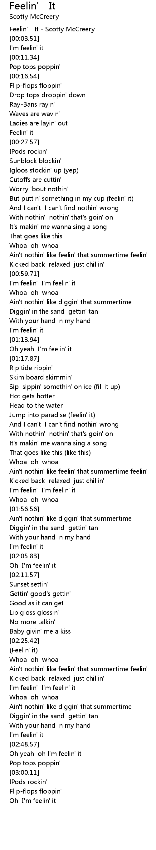 | [00:01.18] | Feelin' It Scotty McCreery |