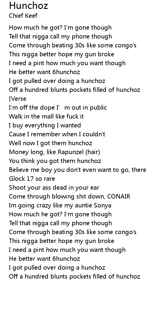 | [00:38.99] | Off a hundred blunts pockets filled of hunchoz |