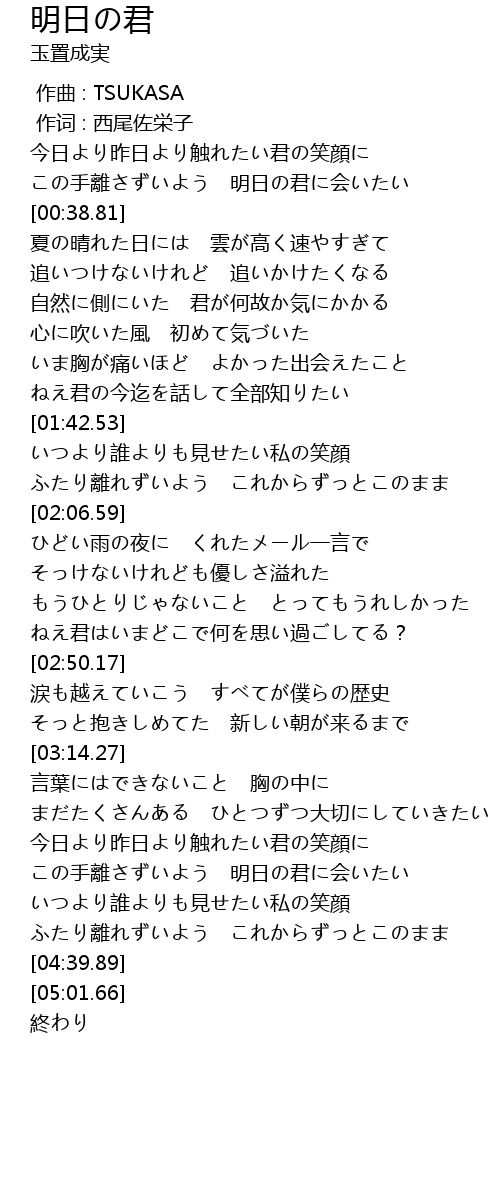 | [04:06.42] | この手離さずいよう 明日の君に会いたい |
