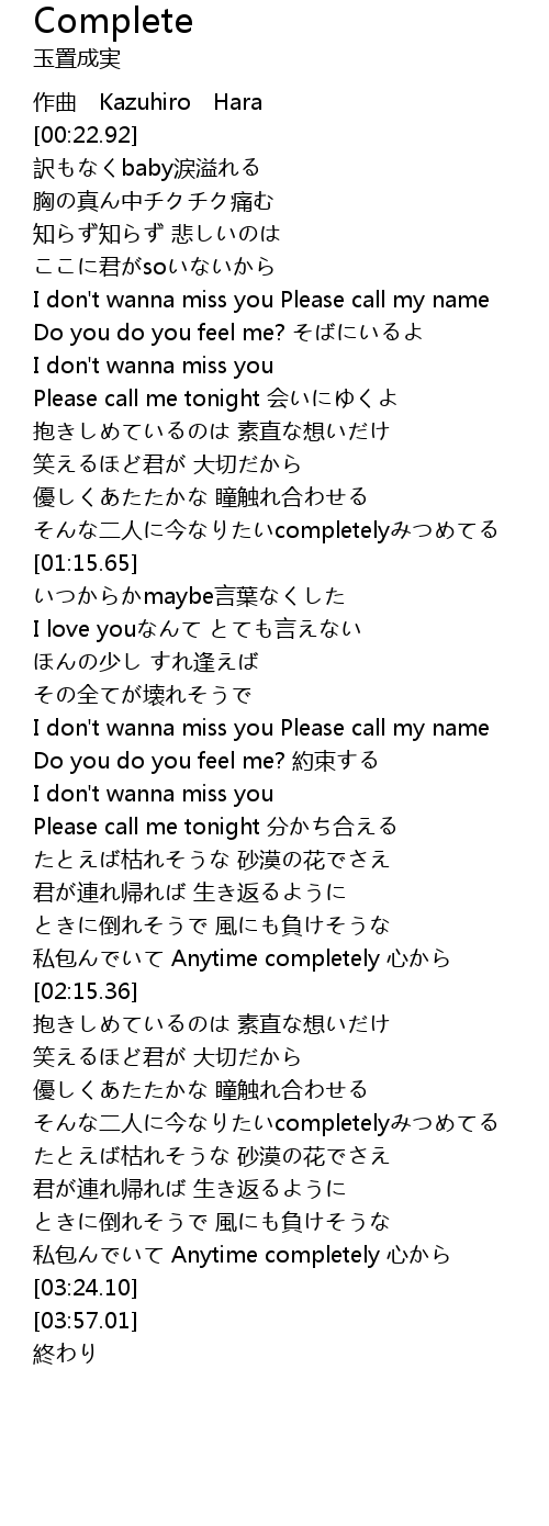 | [00:40.83] | I don' t wanna miss you Please call my name |