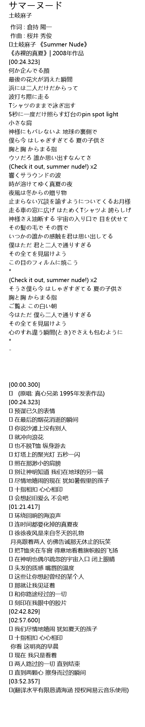 | [00:00.300] | ♪土岐麻子 《Summer Nude》 |