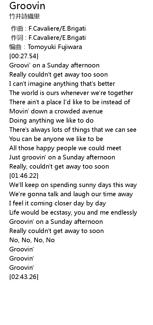 | [02:13.05] | Groovin' on a Sunday afternoon |