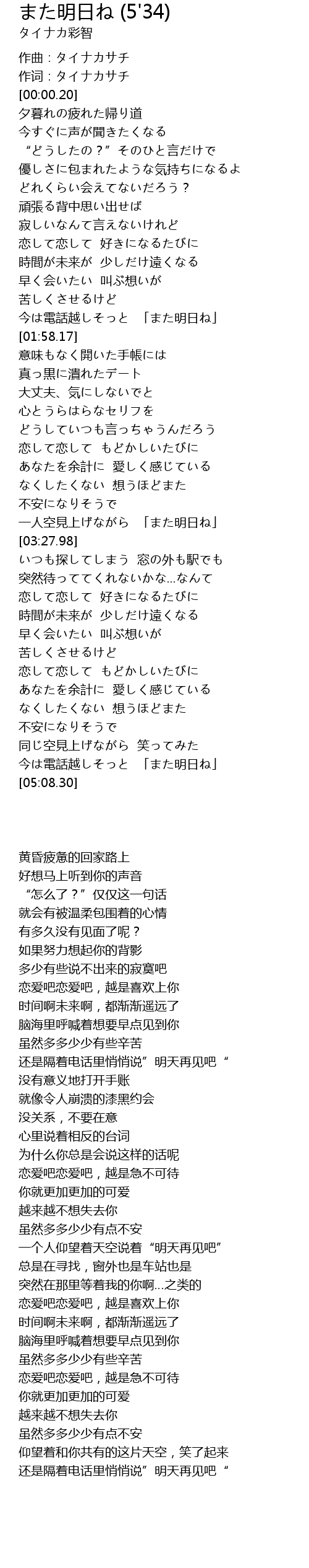 | [01:46.92] | 今は電話越しそっと 「また明日ね」 |