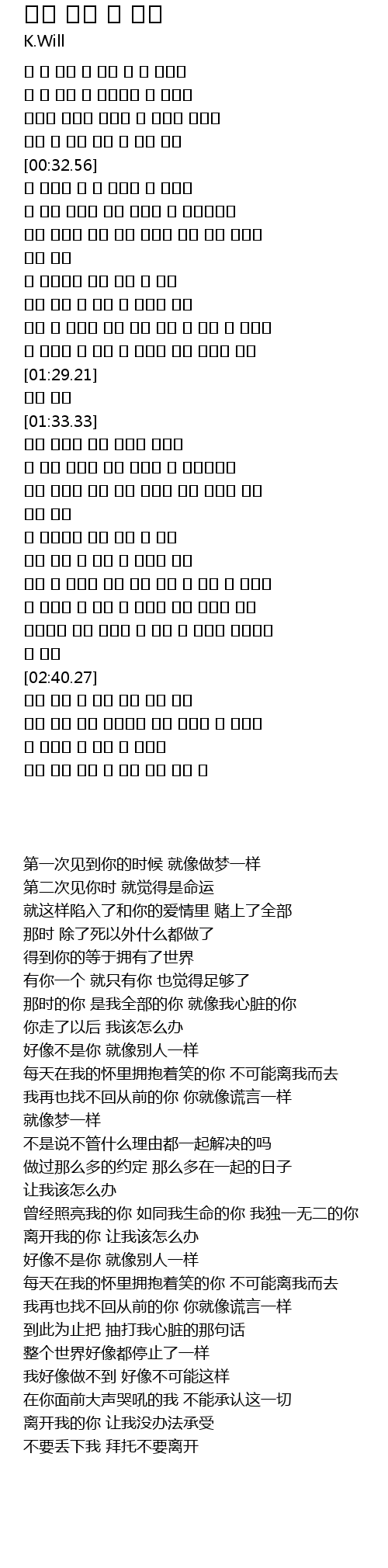 | [01:40.68] | 그 많은 약속은 많은 날들은 다 어떡하라고 |