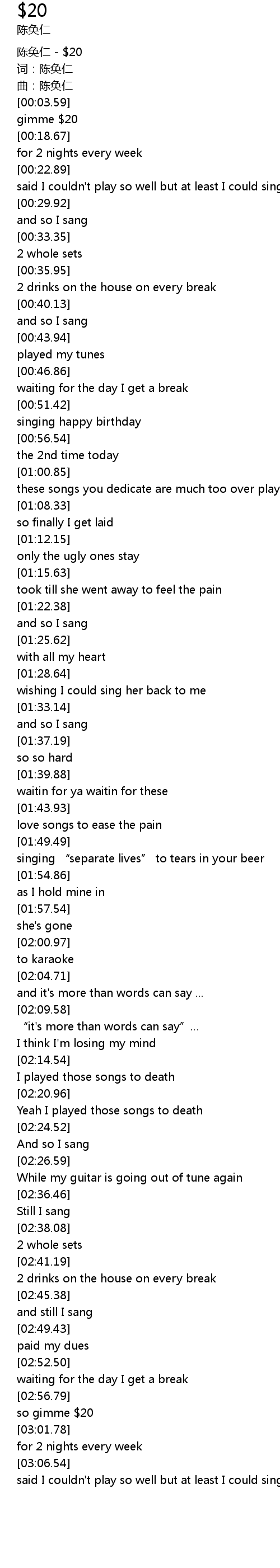 | [00:00.91] | 陈奂仁 - $20 |