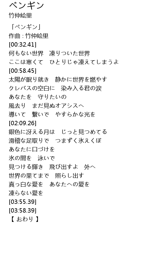 | [00:34.41] | 何もない世界 凍りついた世界 |
