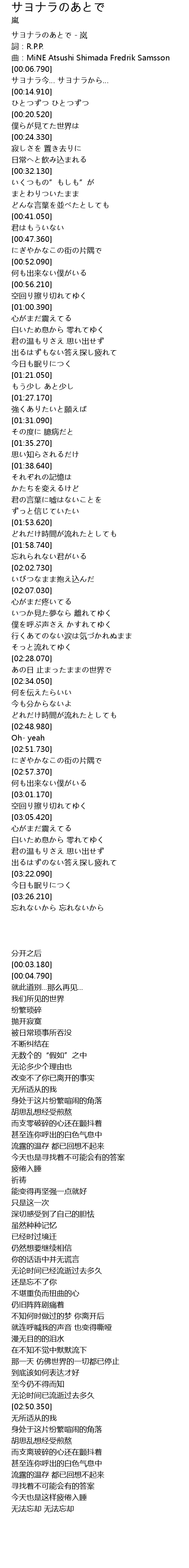 | [00:00.620] | サヨナラのあとで - 岚 |