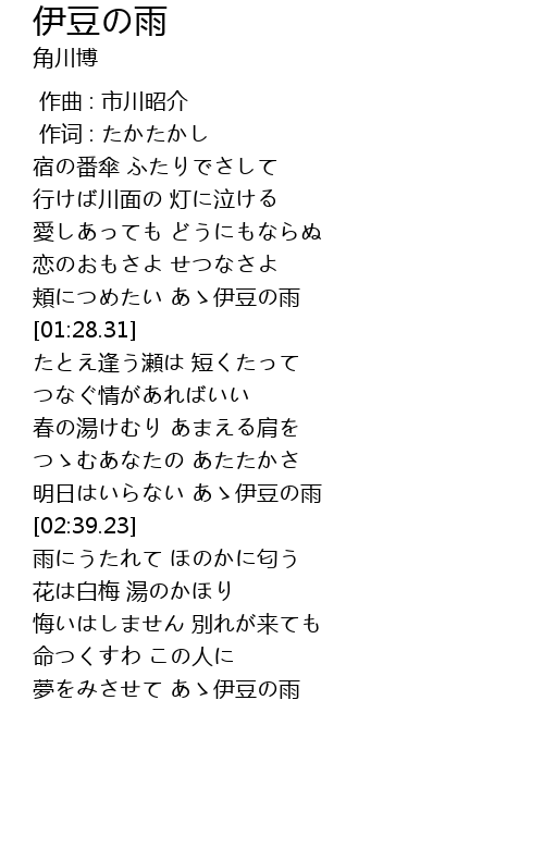 | [01:12.33] | 頬につめたい あゝ伊豆の雨 |