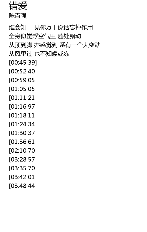 | [04:13.67][03:48.44][02:04.01] | zai kong xu zhong zhe yi sheng yi duan song |