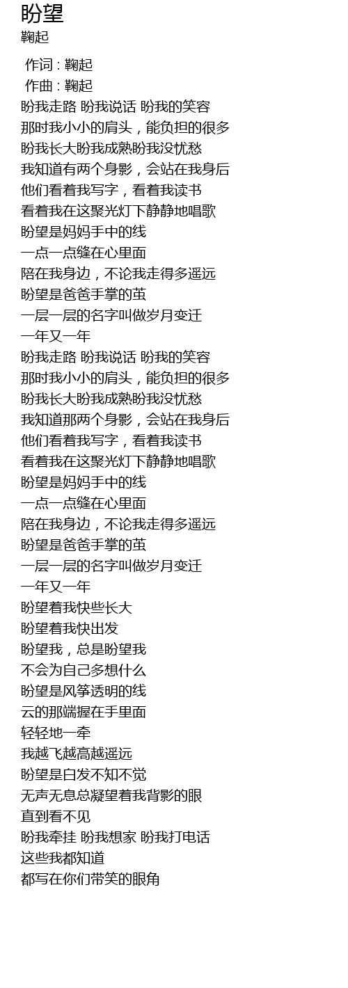 | [00:20.74] | 盼我走路 盼我说话 盼我的笑容 |
