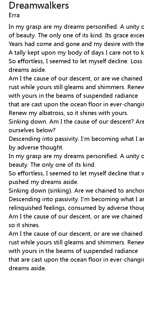 | Am I the cause of our descent, or are we chained to anchors? Mine engrossed in rust while yours still gleams and shimmers. Renew my albatross, so it shines with yours in the beams of suspended radiance | |