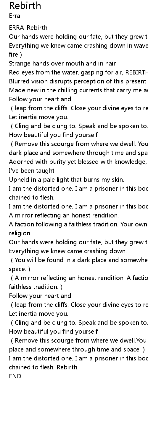 | [00:46.21] | Red eyes from the water, gasping for air, REBIRTH. |