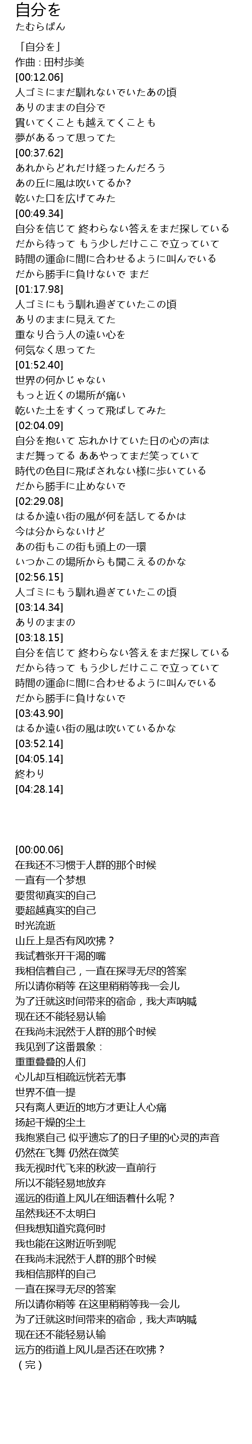 | [03:18.76] | 自分を信じて 終わらない答えをまだ探している |