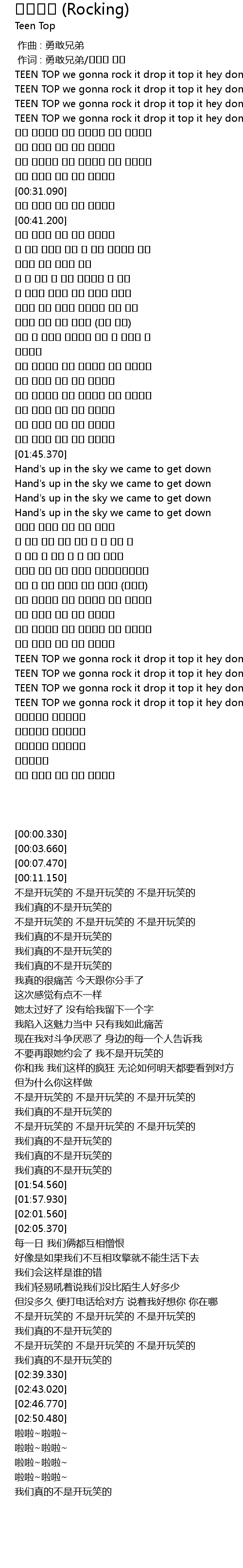 | [02:39.330] | TEEN TOP we gonna rock it drop it top it hey don' t stop it pop it |