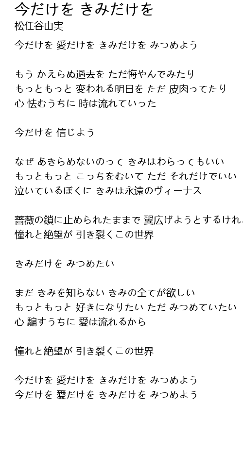 | 今だけを 愛だけを きみだけを みつめよう |