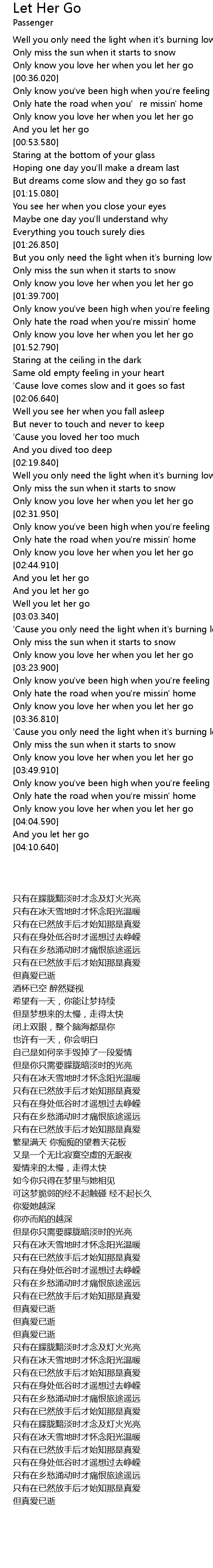 | [00:33.220] | Only know you love her when you let her go |
