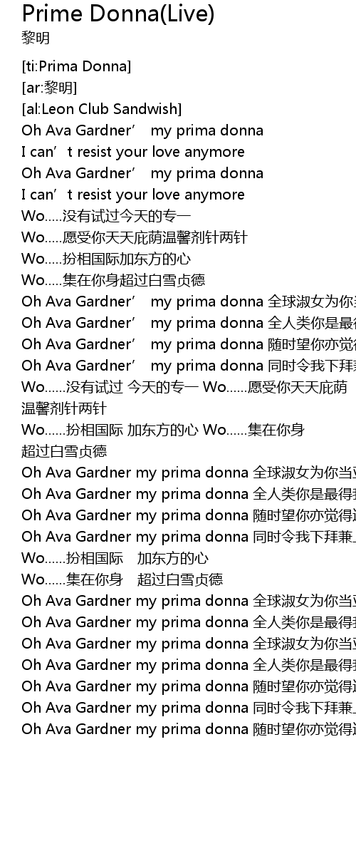 | [00:50.12] | Oh Ava Gardner’ my prima donna 随时望你亦觉得过瘾 |