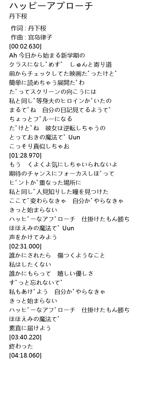 | [03:24.130] | ハッピーなアプローチ 仕掛けたもん勝ち |