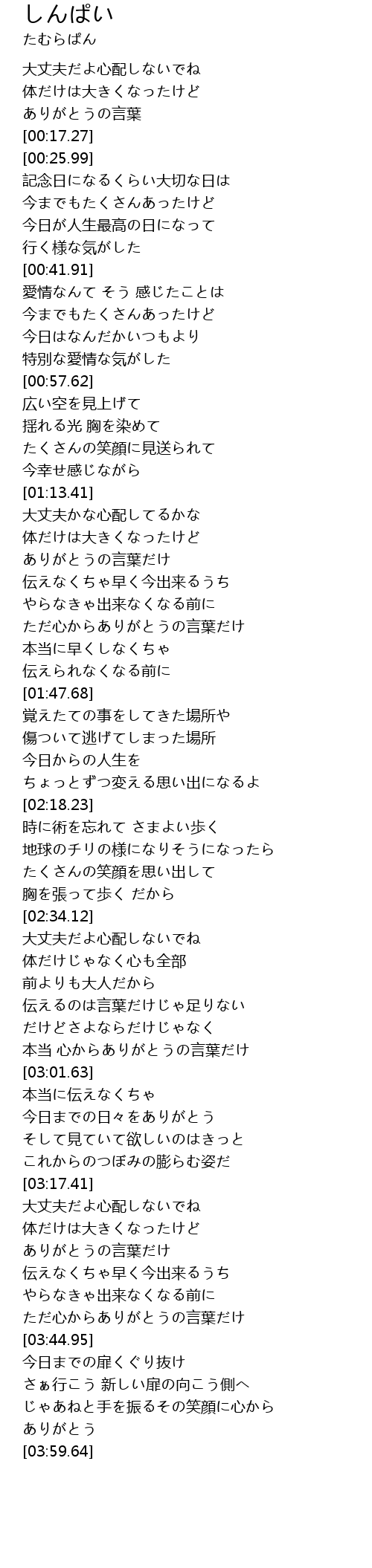 | [03:17.63] | 大丈夫だよ心配しないでね |