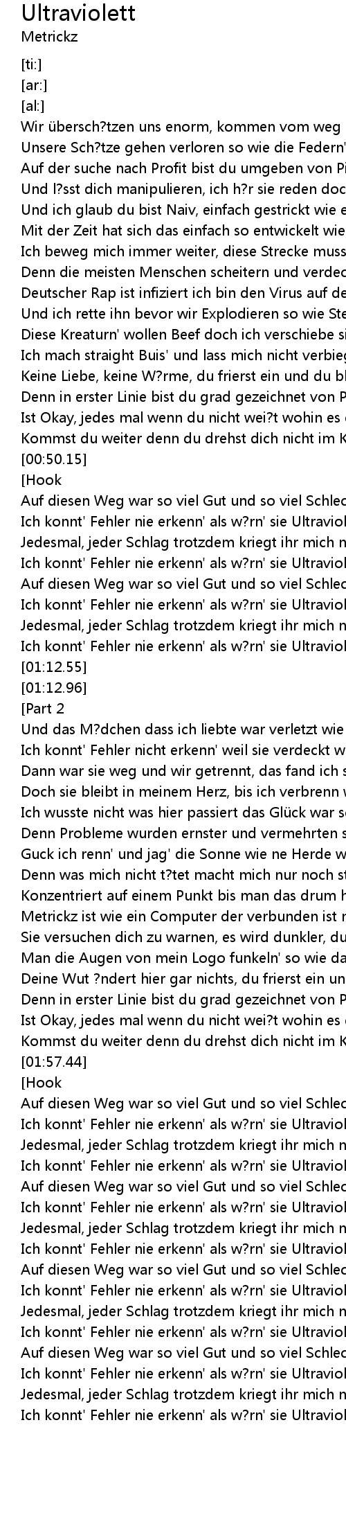 | [00:53.54] | Ich konnt' Fehler nie erkenn' als w? rn' sie Ultraviolett |