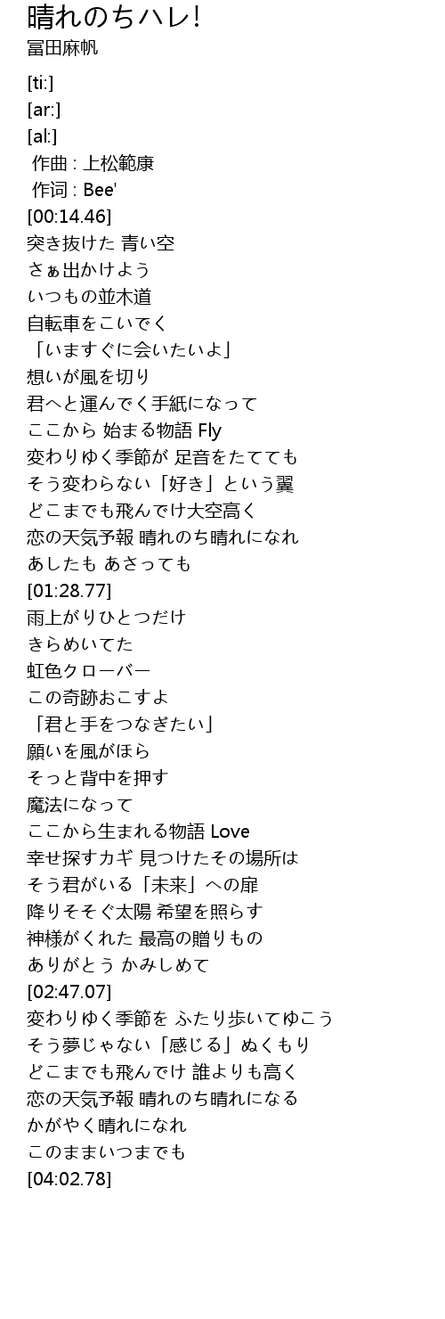 | [01:14.39] | 恋の天気予報 晴れのち晴れになれ |