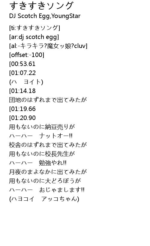 | [00:12.40][00:53.61][01:48.41] | すき!すき!すき!すき! |