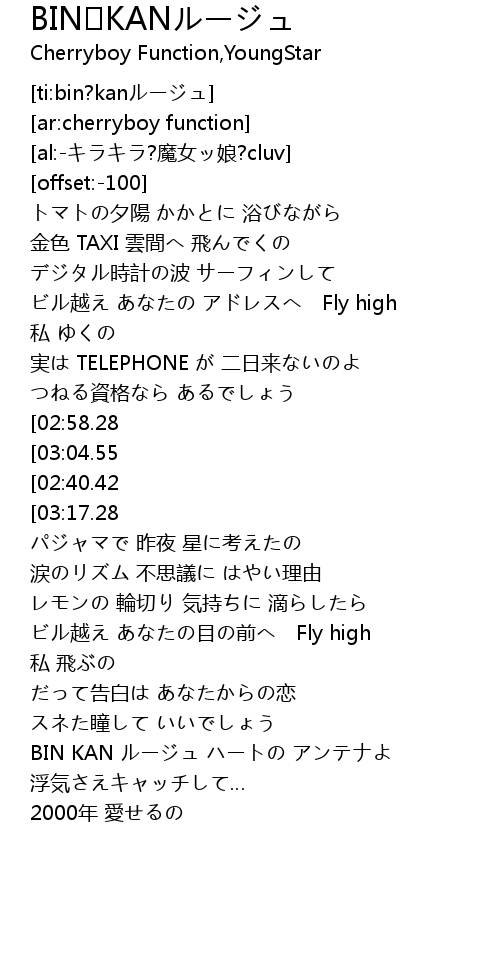 | [00:58.00][02:58.28] | BIN KAN ルージュ ジェラシー ふりかけて |