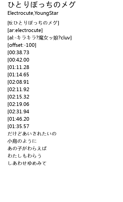 | [00:18.26][01:14.65] | ひとりぽっち |