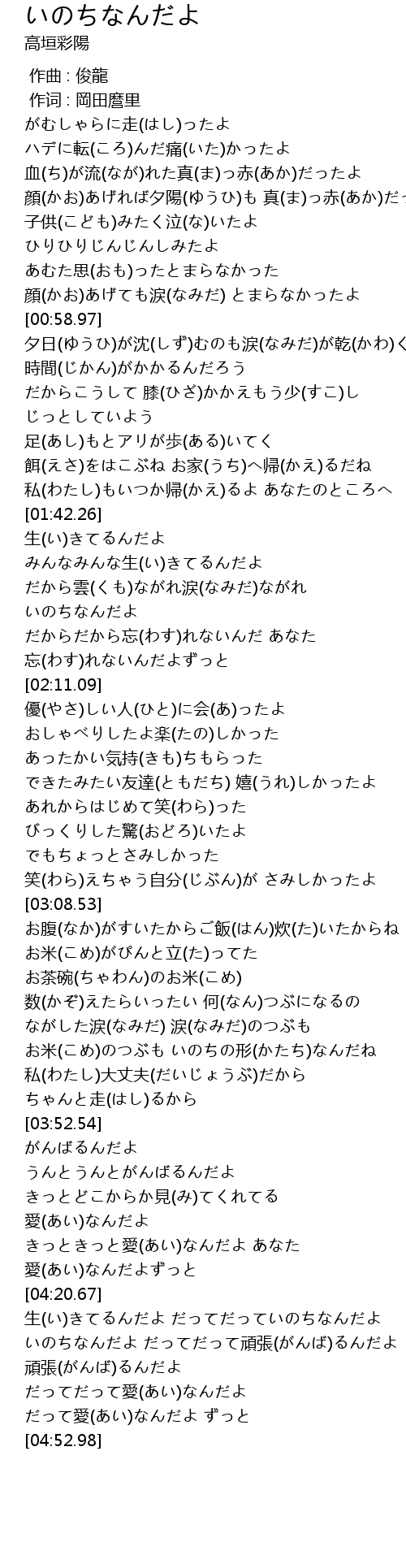 | [04:26.00] | 生(い)きてるんだよ だってだっていのちなんだよ |
