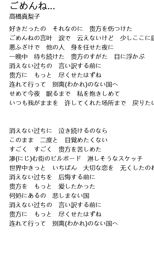 | ごめんねの言叶 涙で 云えないけど 少しここに居て | |