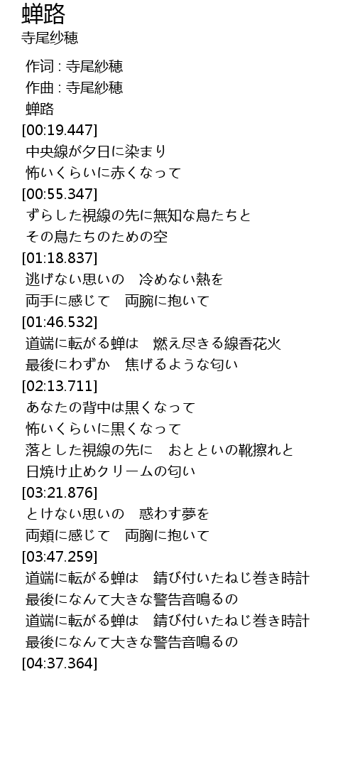 | [03:48.944] | 道端に転がる蝉は 錆び付いたねじ巻き時計 |
