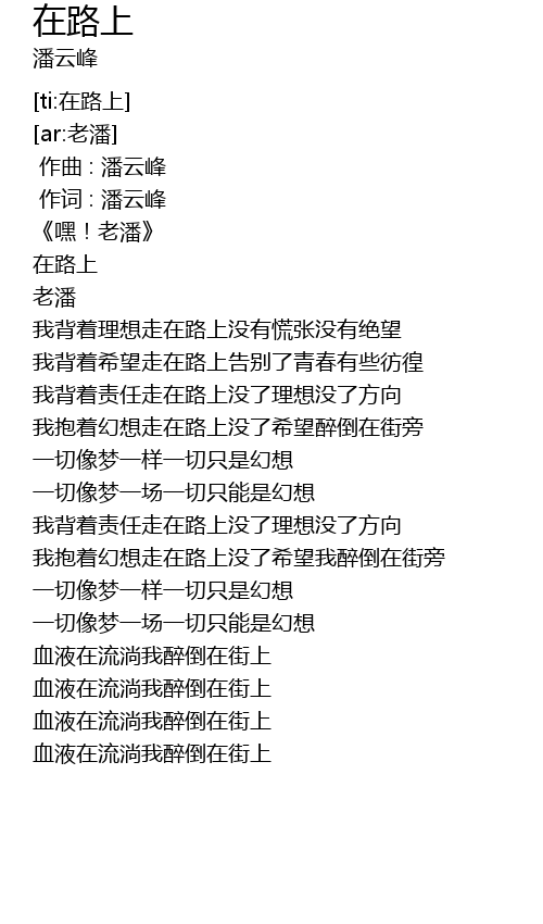 | [03:03.594] | 我抱着幻想走在路上没了希望我醉倒在街旁 |