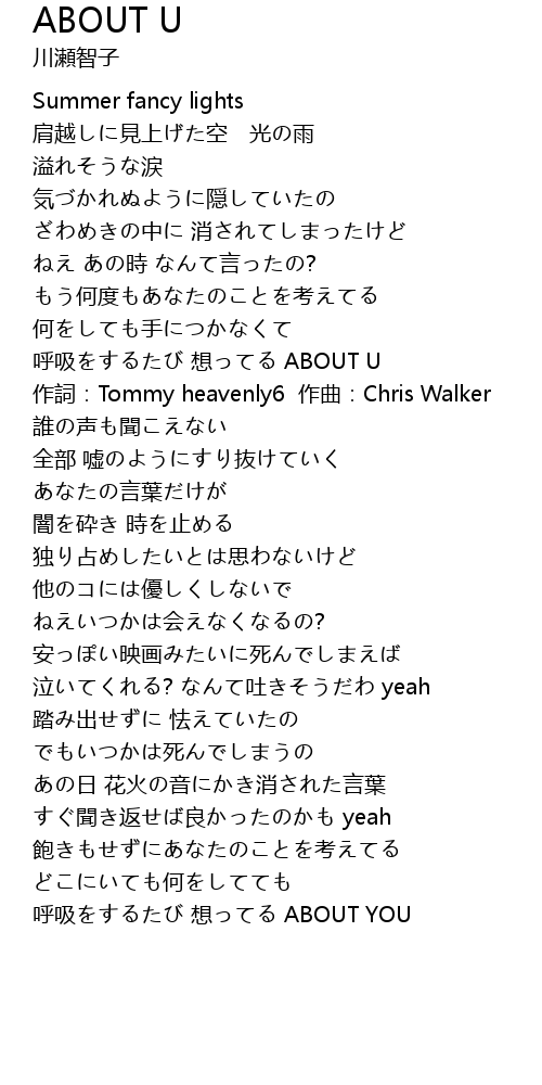 | [00:47.067] | 呼吸をするたび 想ってる ABOUT U |