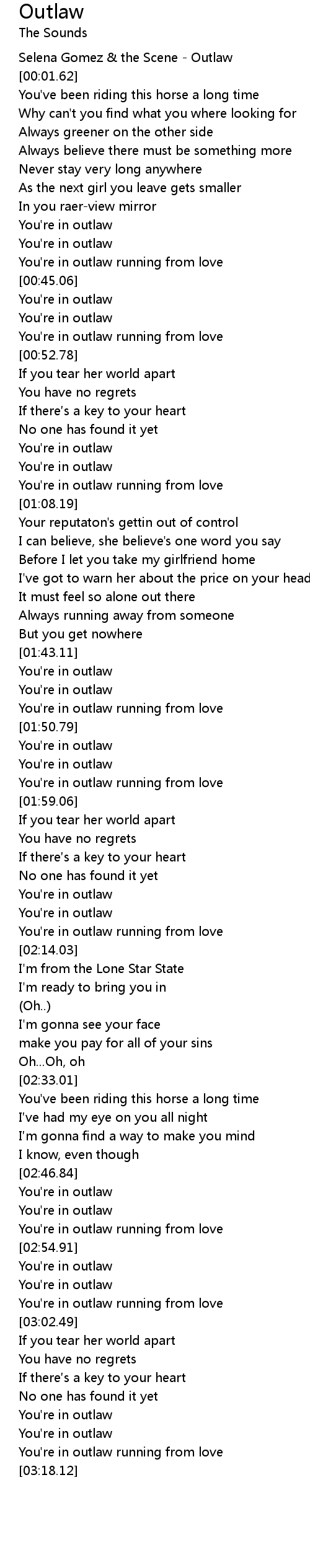 | [00:00.00] | Selena Gomez & the Scene - Outlaw |