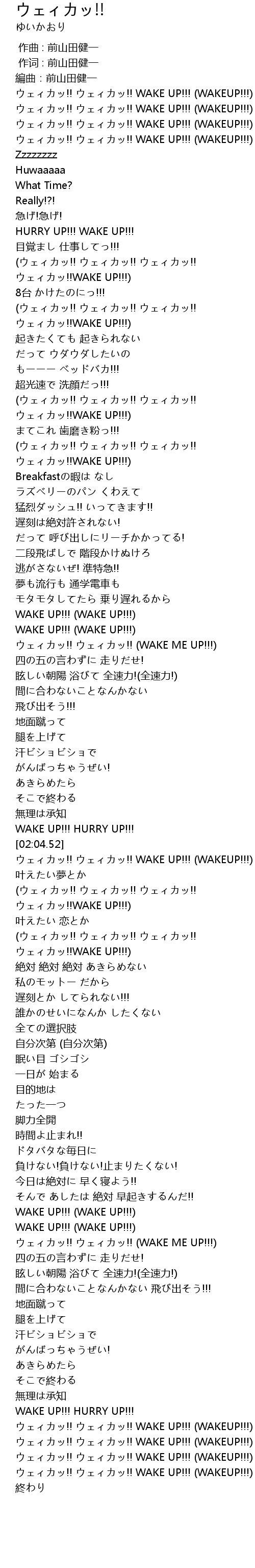 | [03:59.61] | ウェィカッ!! ウェィカッ!! WAKE UP!!! (WAKEUP!!!) |