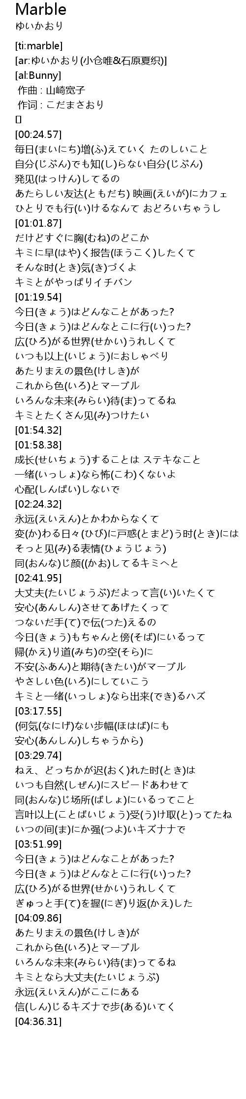 | [02:59.42] | 帰(かえ)り道(みち)の空(そら)に 不安(ふあん)と期待(きたい)がマーブル |