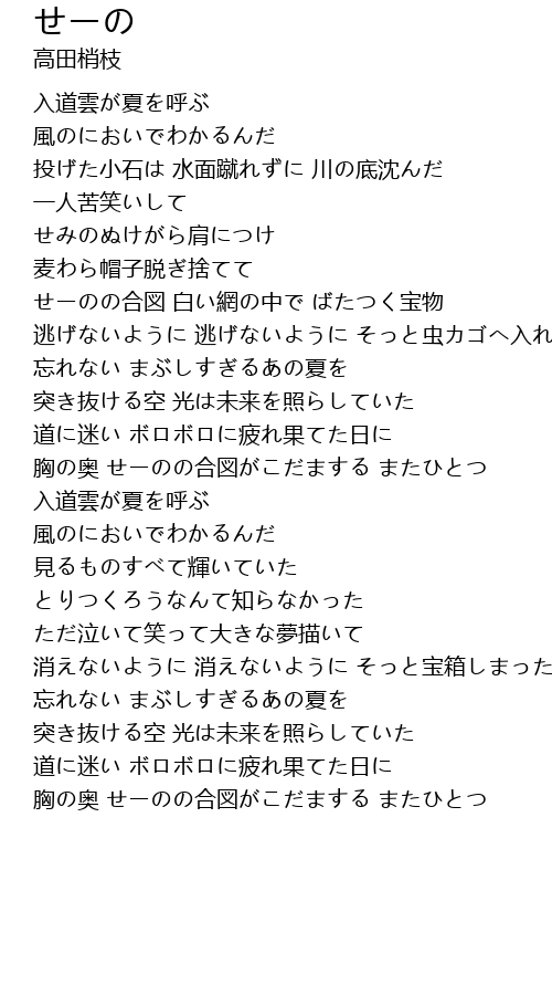 | 胸の奥 せーのの合図がこだまする またひとつ | |