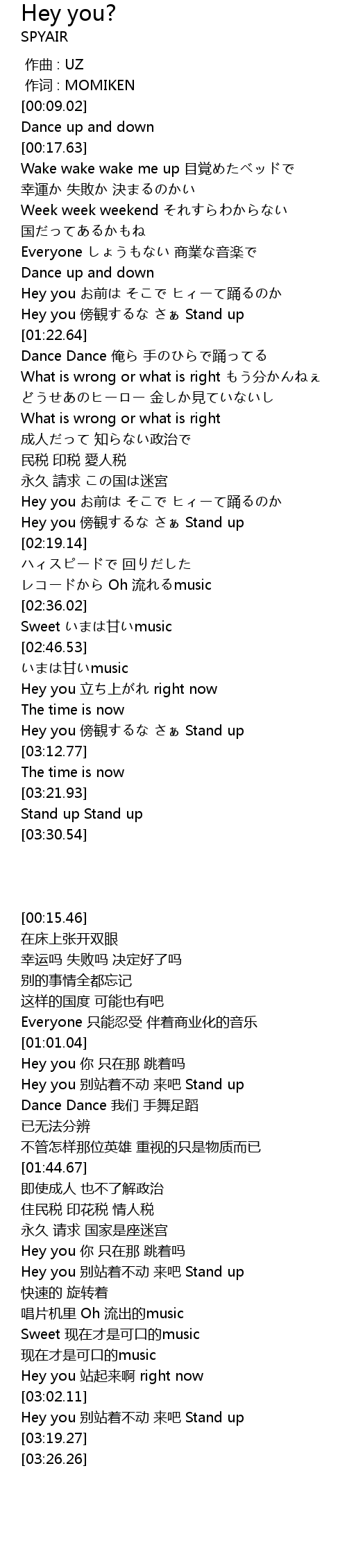 | [03:04.64] | Hey you 别站着不动 来吧 Stand up |