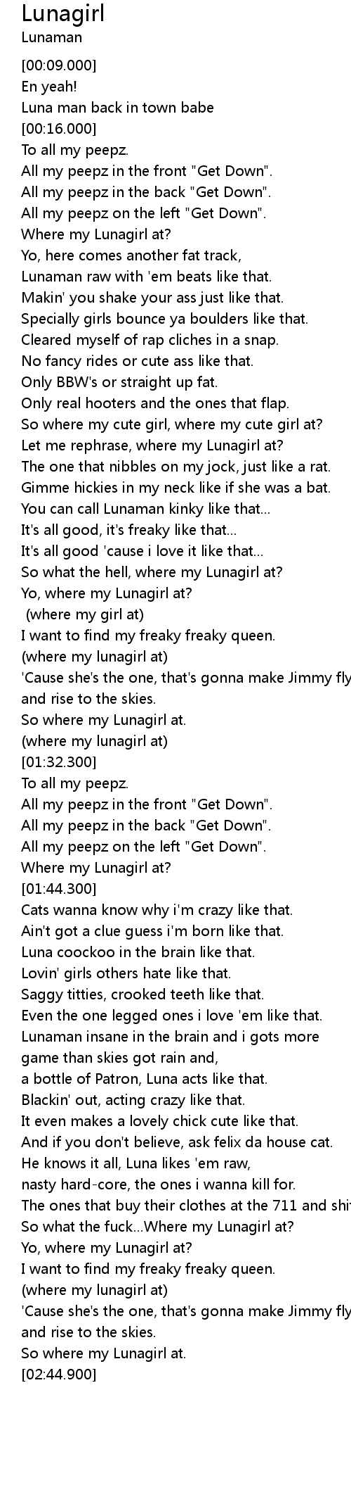 | [02:22.900] | So what the fuck...Where my Lunagirl at? |