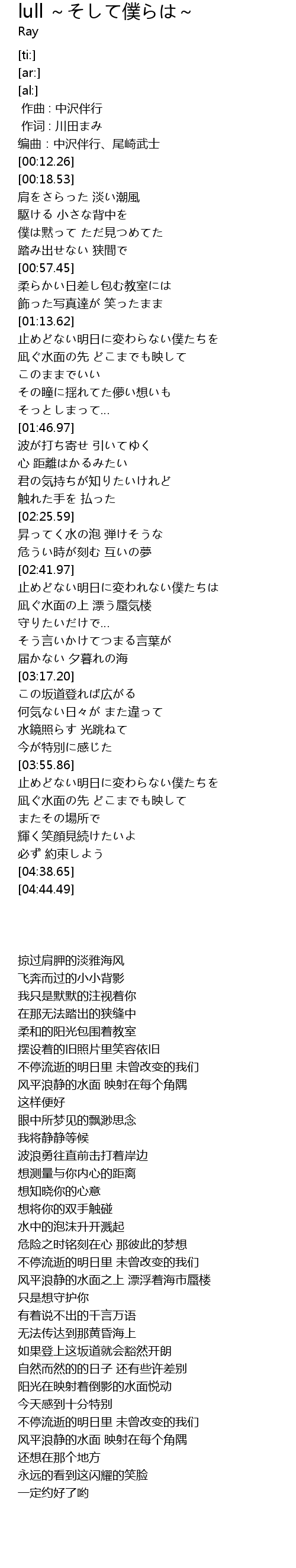 | [01:21.79] | 凪ぐ水面の先 どこまでも映して |