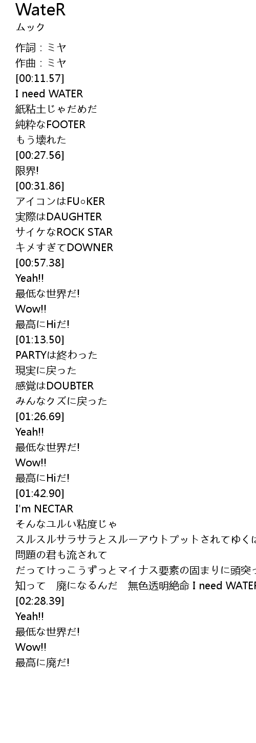 | [02:24.50] | 知って 廃になるんだ 無色透明絶命 I need WATER |