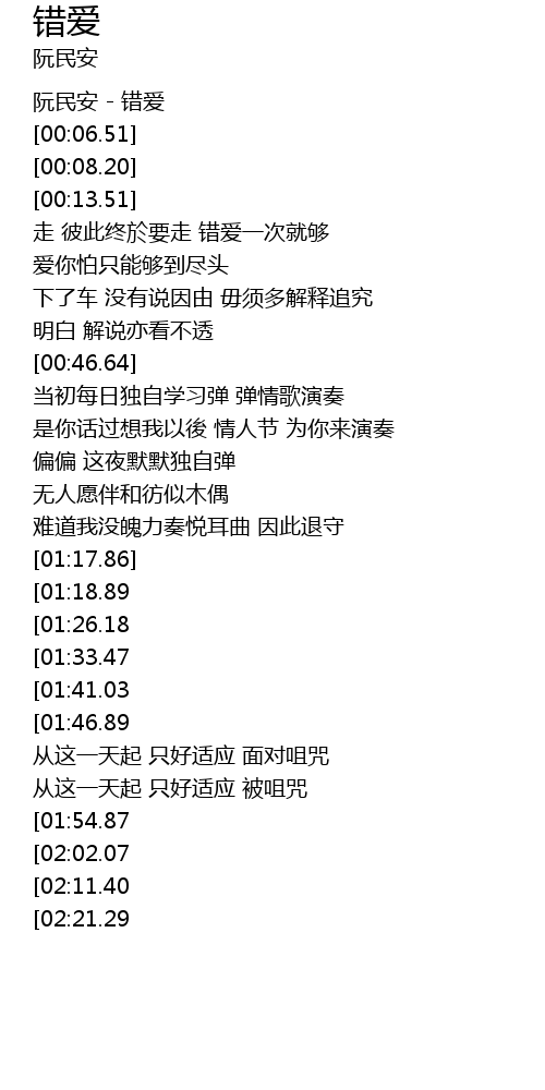 | [00:00.19] | 阮民安 - 错爱 |