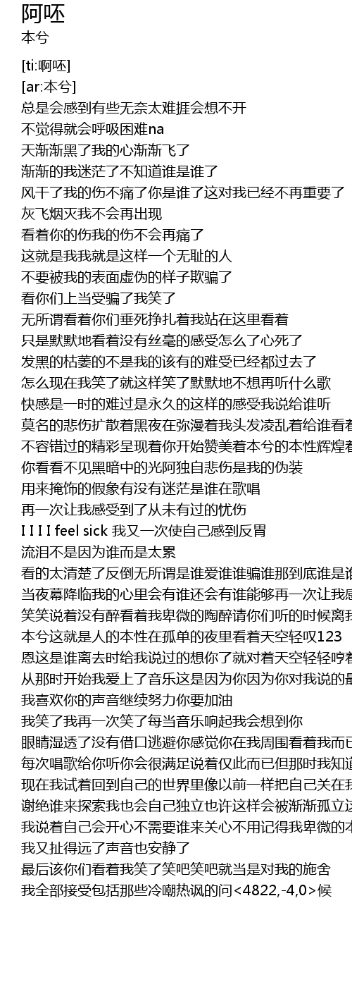 | [02:01.550] | 本兮这就是人的本性在孤单的夜里看着天空轻叹123 |