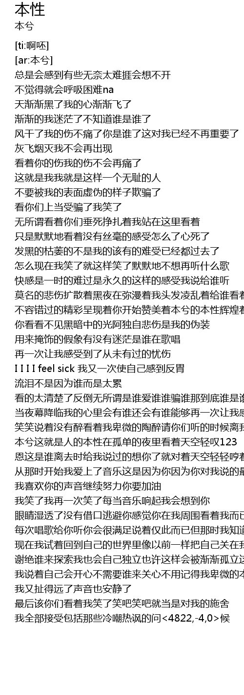 | [01:59.450] | 本兮这就是人的本性在孤单的夜里看着天空轻叹123 |