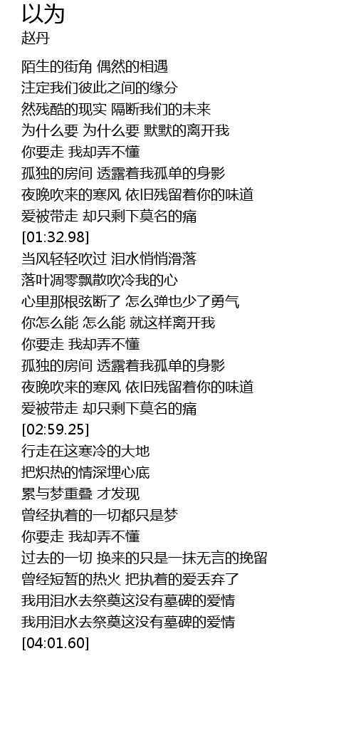| [03:17.68] | 你要走 我却弄不懂 |