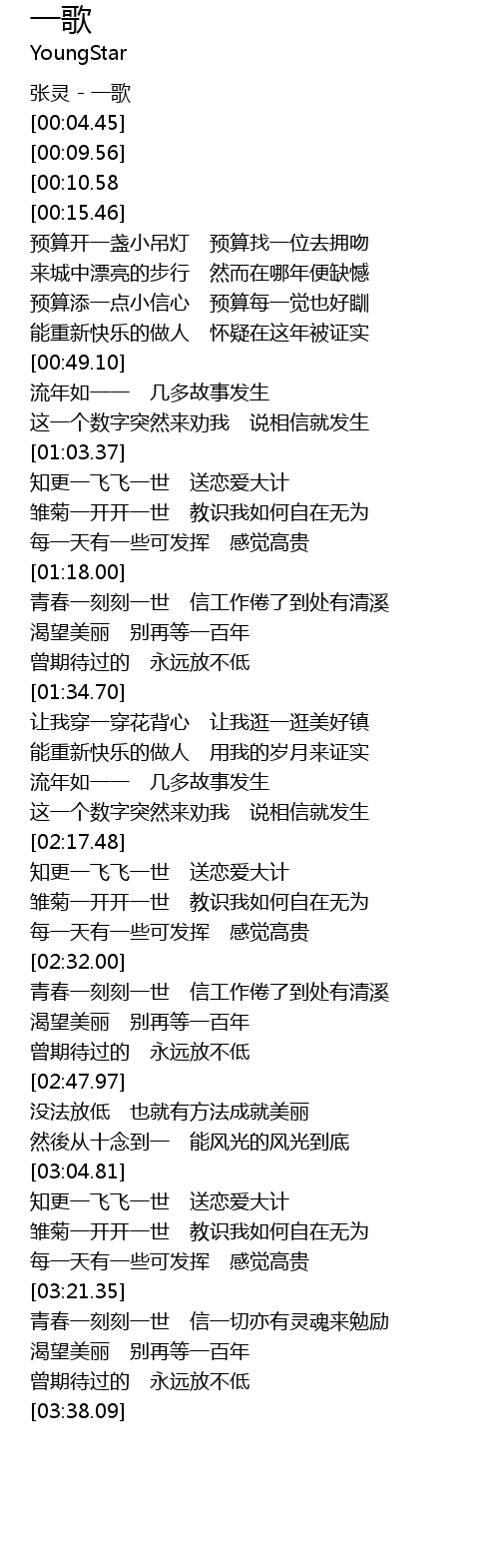 | [03:21.69] | qīng chūn yī kè kè yī shì xìn yī qiè yì yǒu líng hún lái miǎn lì |